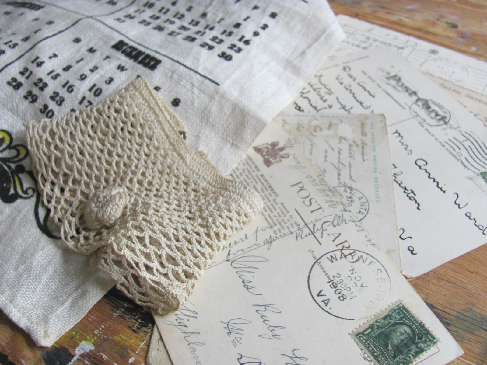 these are not etsy finds, but i thought i would show you anyway. from an unexpected stop at an antique shop this weekend. i can never just drive past - if i did, i would then spend hours thinking about what i might have missed. so i saved myself some stress and stopped. i found an old tea towel to make ornaments out of, some shabby old postcards with writing on them, and a dirty, but fabulous lace cuff.